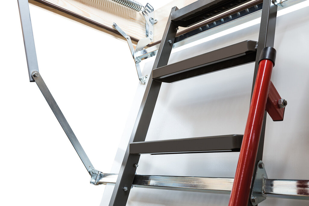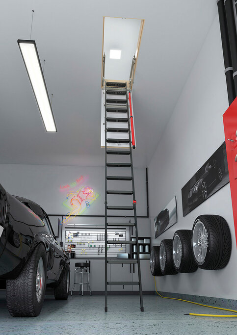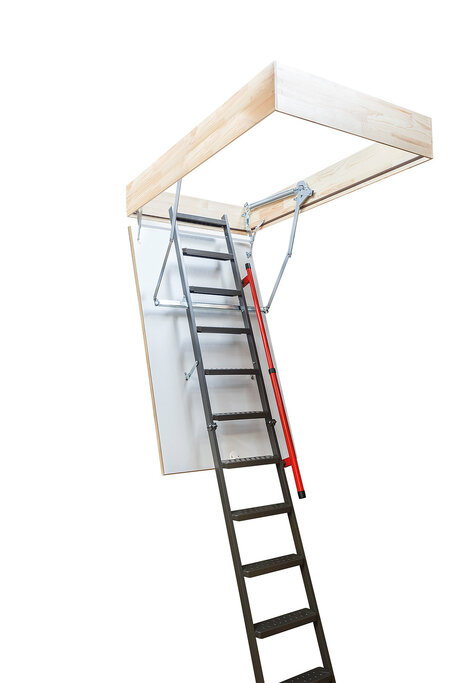 Складная металлическая чердачная лестница FAKRO LMP оптимальное решение для загородных домов и дач с высокими потолками от 300 до 366 см. Поручень с вспомогательным механизмом и плавным открыванием. Фиксаторы, предотвращающие случайное складывание.
