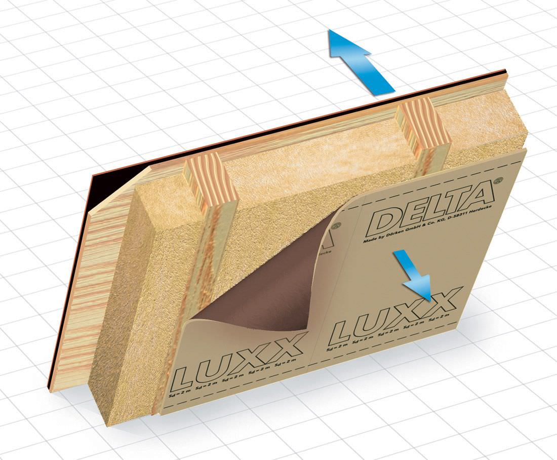 Delta LUXX пароизоляция с ограниченной проницаемостью, используемая для деревянных или каркасных домов. Применяется в устройстве крыш, стен в помещениях с нормальными уровнем влажности и температурой. Диффузия Sd=2 м обеспечивает равномерное удаление пара без риска образования конденсата. Способствует просушиванию утеплителя в теплое время года.