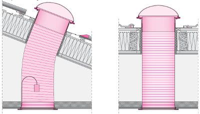 Туннель SLT оборудован гибкой гофрированной трубой, которая значительно упрощает монтаж конструкции позволяя обходить отдельные препятствия. Внутренняя поверхность имеет светоотражающее покрытие и рассеиватель, что позволяет передавать в помещение мягкий, но достаточно интенсивный солнечный свет. Стандартную длину (210 см) можно увеличить (до 450 см) при использовании комплекта SLM.