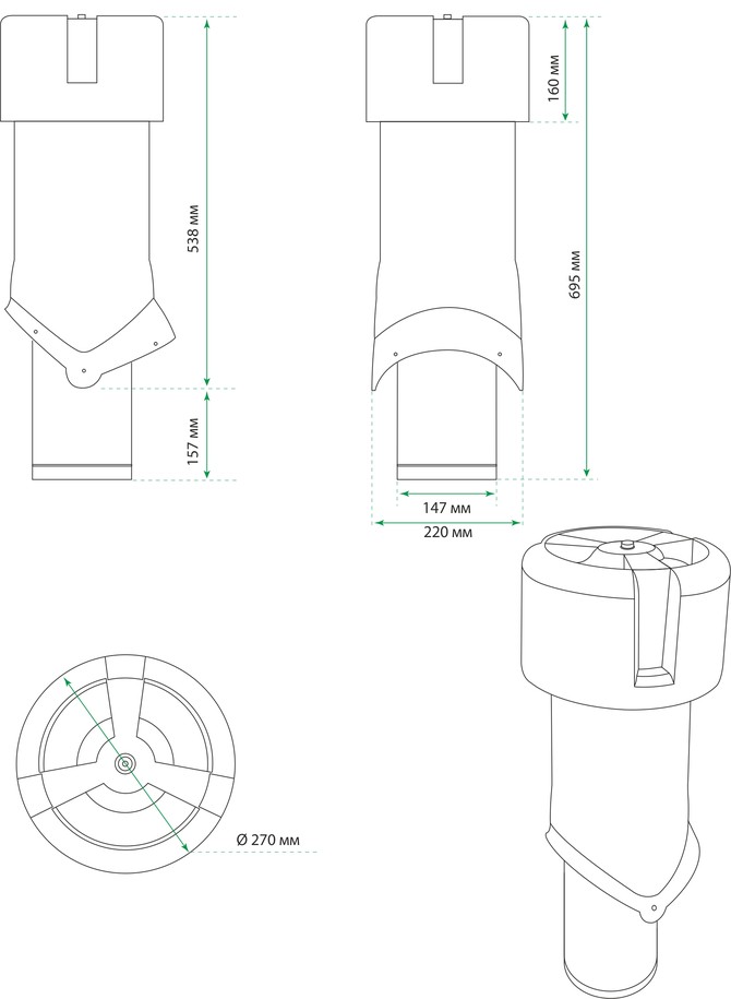 Вентиляционный выход с колпаком, внутренний диаметр 150мм, высота 500мм. Дополнительно необходим проходной элемент на кровлю.