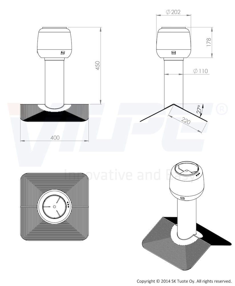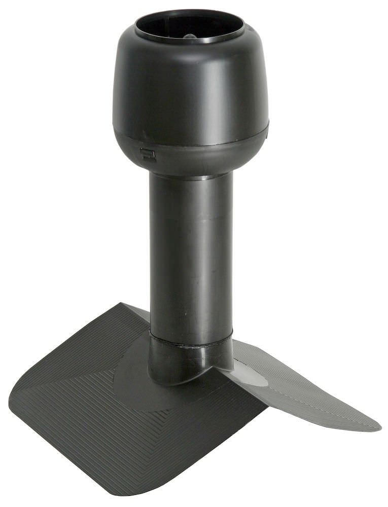 Модель устанавливается на коньке крыши, конструкция предназначена для кровель с уклоном 27 градусов из битумного материала. Наличие колпака препятствует попаданию осадков внутрь. Дефлектор вводится между двумя слоями кровельного покрытия, что обеспечивает высокую герметичность и надежность.